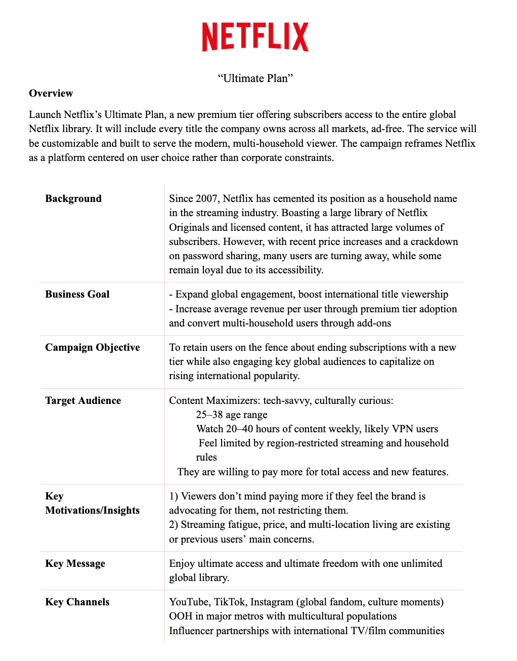 For our final project, my team and I spent the semester building a deep understanding of consumer behavior around Netflix. Using a mix of quantitative and qualitative methods, including Qualtrics surveys, Talkwalker social listening, focus groups, and in-depth interviews, we identified why Netflix no longer feels like “home” for many users. Based on these insights, we developed a creative brief and proposed Ultimate Netflix, a premium, consumer-first tier designed to restore shared viewing, emotional connection, and long-term brand loyalty.