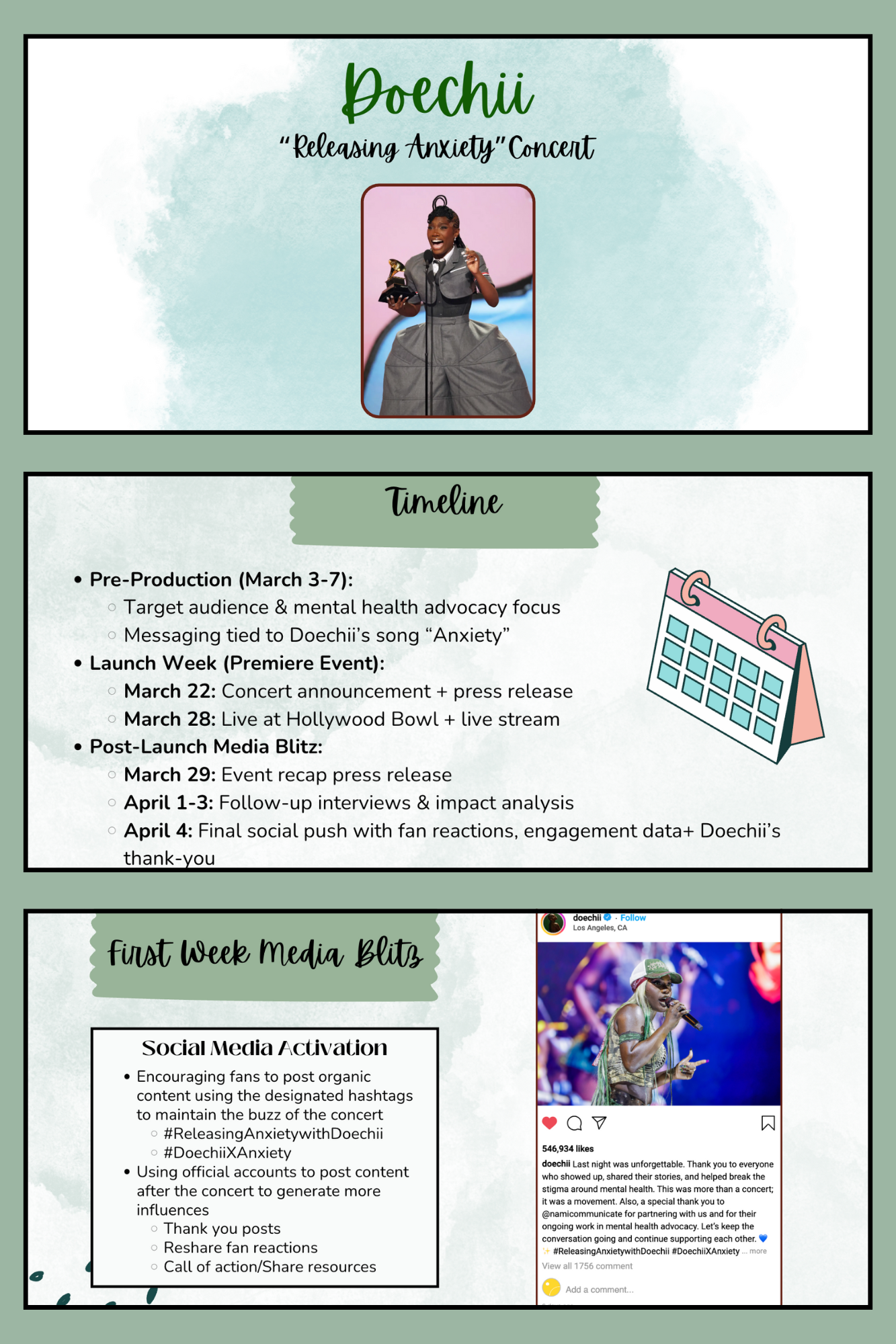 My group and I created Releasing Anxiety, a mock concert campaign launched alongside Doechii’s single Anxiety, in collaboration with NAMI (National Alliance on Mental Illness). The campaign aimed to destigmatize mental health through a live music experience that combined performance with accessible wellness resources. I helped shape the strategy to align Doechii’s artistic brand with NAMI’s mission, using the concert as a platform to drive awareness and social impact.