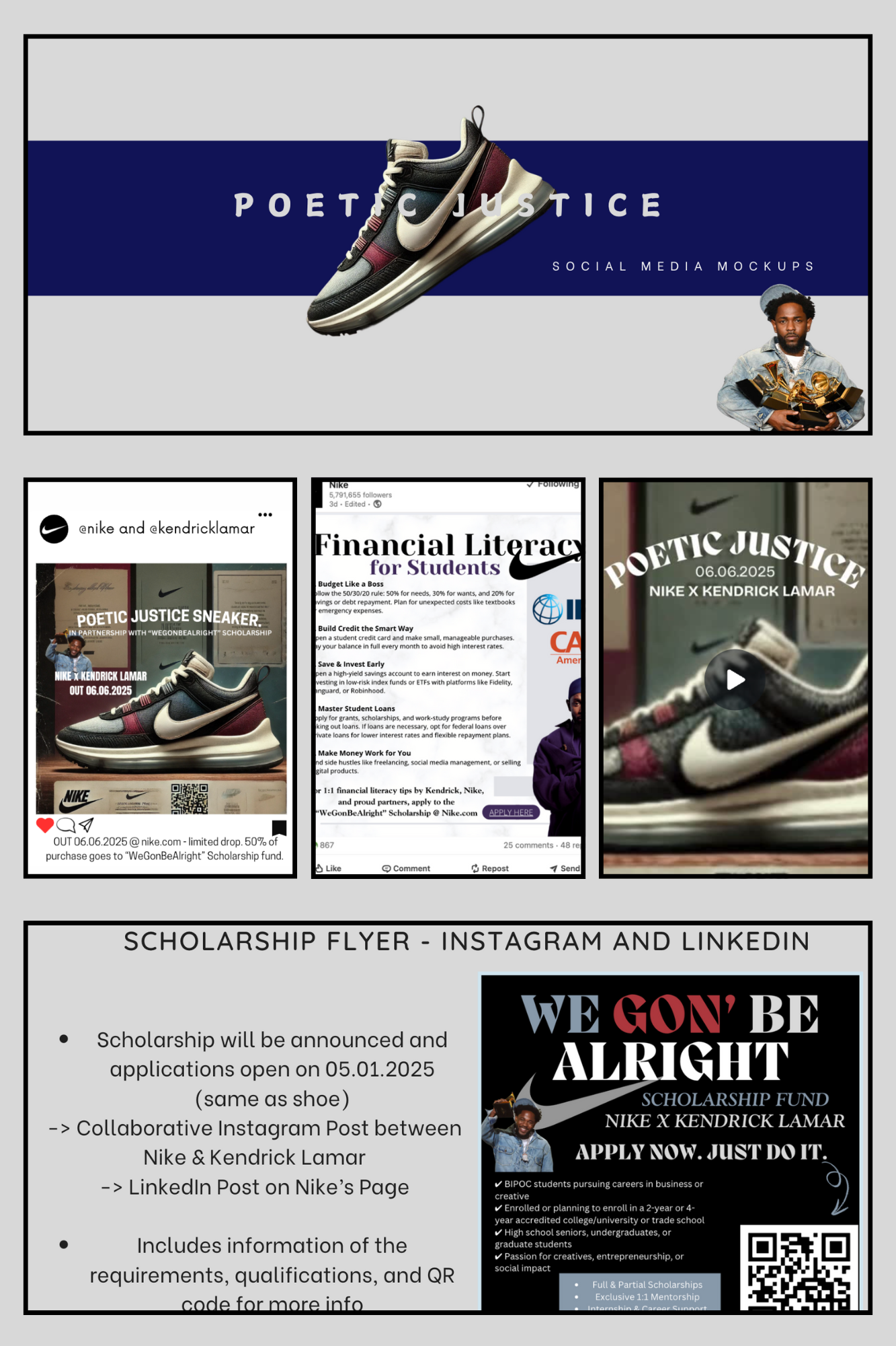 I created “Poetic Justice,” a collaboration between Nike and Kendrick Lamar that blends music, sneaker culture, and social impact. The campaign centers on a limited-edition sneaker drop and a scholarship program for BIPOC students pursuing careers in creative and business fields. I designed the initiative to amplify Lamar’s voice in social justice while reinforcing Nike’s commitment to education and empowerment through financial aid, mentorship, and cultural storytelling. Timed to launch shortly after Lamar’s Super Bowl performance, the campaign ensures both cultural relevancy and meaningful human impact.