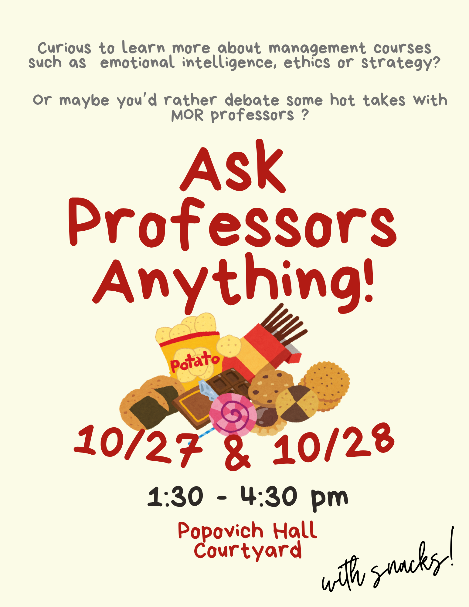 This flyer was created to promote a Department of Management and Organization event designed to foster open, informal dialogue between students and faculty. During the event, students had the opportunity to ask professors questions about career paths and engage in lighthearted conversations in an approachable, interactive setting.