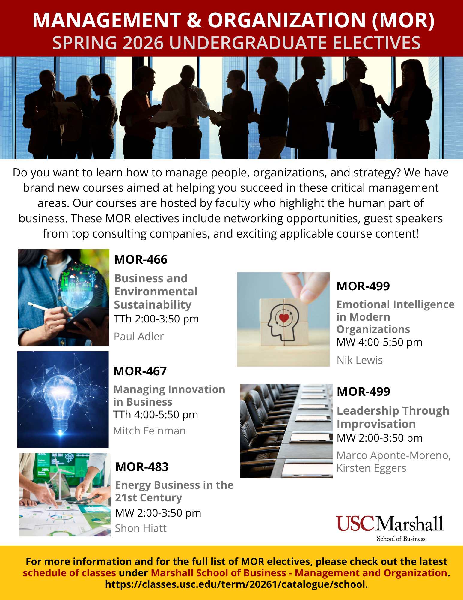 I currently serve as a teaching assistant for a new Spring 2026 course at USC Marshall that focuses on emotional intelligence in modern organizations. The course equips students with practical frameworks for managing people and showing up as effective, authentic leaders in the workplace. In my role, I redesigned the full curriculum slide deck and created promotional flyers to build interest in the course. I also edited the textbook for the course by reorganizing it in a more digestible way.